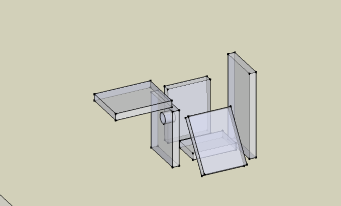 | When you have finished cutting all your pieces. You will then be ready to start drilling the entry and pilot holes. With a 1/8 drill bit per drill the front,back and roof of your house. Next mark and drill the entry hole using a 1 3/8 hole saw bit. |